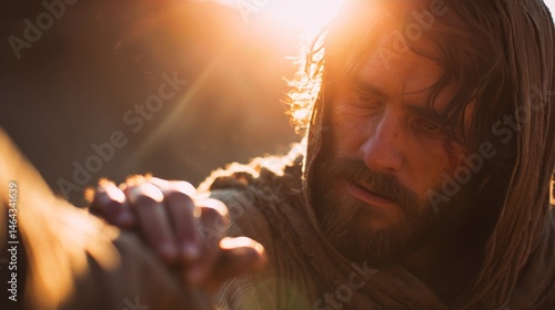 Jesus christ offering help in a biblical scene with sunlight illuminating his face