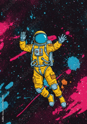 Astronaut floating in the cosmic void amidst vivid splashes of paint, embodying retro futurism and dreams of otherworldly exploration