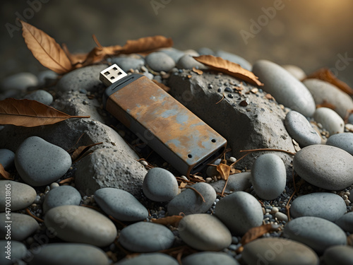 Forgotten Data: A weathered flash drive rests amidst a bed of stones, hinting at the passage of time and the potential loss of crucial information.