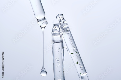 Three different face serum pipettes on a neutral background.