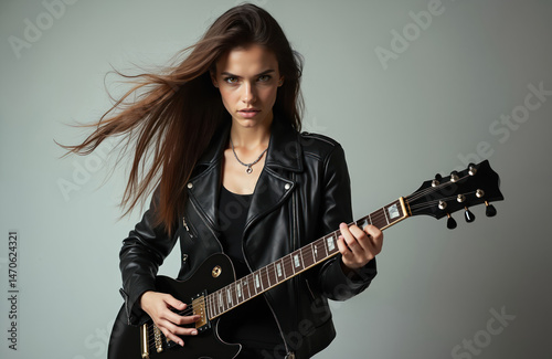Young woman plays electric guitar looking intense. Long hair blowing. Rock musician in leather jacket. Female guitarist in music studio ready to perform. Attractive girl with instrument.