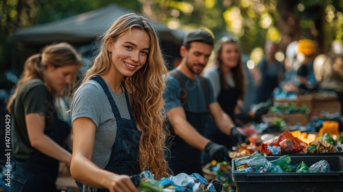 A smiling young woman with long blonde hair volunteers at an outdoor recycling event, sorting plastic and waste materials with a team of environmentally conscious people.
