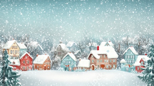 Winter scene with colorful houses covered in snow during a snowfall. Festive holiday background with a quaint village and snow covered trees, creating a cozy Christmas atmosphere.