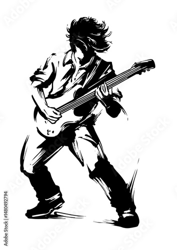 Energetic Electric Guitarist in Japanese Ink Brush Style – Dynamic Sumi-e Illustration