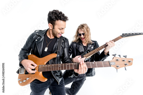 two musicians playing electric guitars isolated on white, electric guitar rock concept