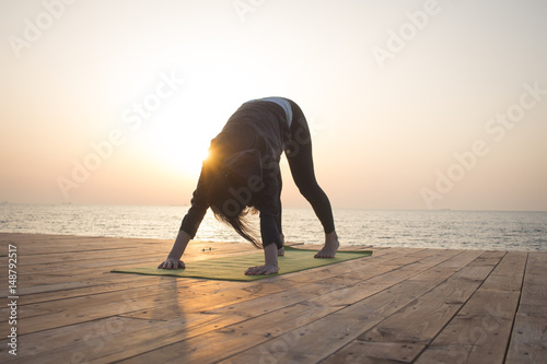 Young woman doing yoga in the beach. Morning sea background.