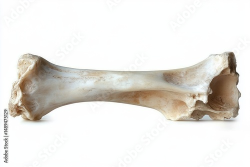 Close-up of a large animal bone isolated on a white background showing detailed texture and natural worn edges
