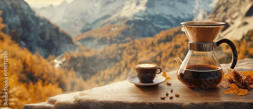 Preparação de café em um cenário de montanha selvagem de outono com imagem de espaço para texto