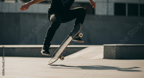 Skateboarder performing mid-air trick, showcasing urban sport action and dedication, focus on airborne skateboard and motion