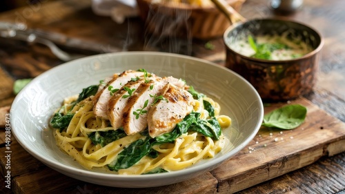 Chicken florentine pasta with creamy fettuccine noodles, grilled chicken slices and wilted spinach served in white ceramic bowl on rustic wooden serving board