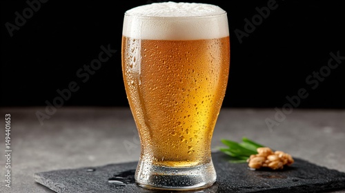 A frosty glass of golden lager with condensation beads, placed on a dark slate surface, warm spotlight highlighting foam head, and generous empty space above for text placement