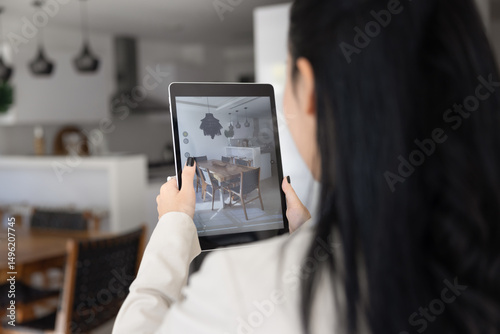 Woman pointing camera toward dining area using tablet, taking photo of interior, filming property for virtual tour, conduct remote viewing for client, create content for home design, renovation blog