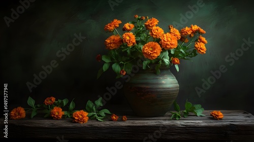 Vibrant Orange Flowers in Rustic Vase Still Life Photography