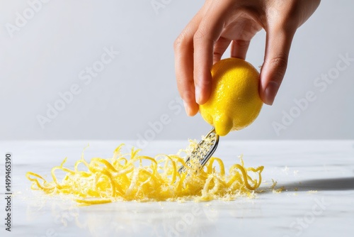 Bright minimalistic food photography, close-up flat lay of a female hand zesting a lemon with a fine zester, curly lemon zest falling onto a white marble surface,