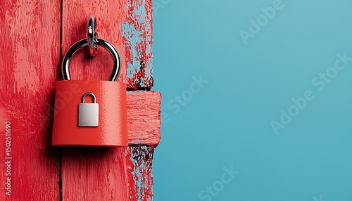 Red Padlock on a Weathered Red Wooden Door Against a Blue Background