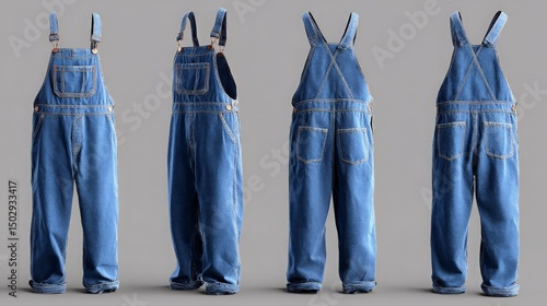 blank blue denim overalls mockup front side and back views, workwear and casual fashion templates