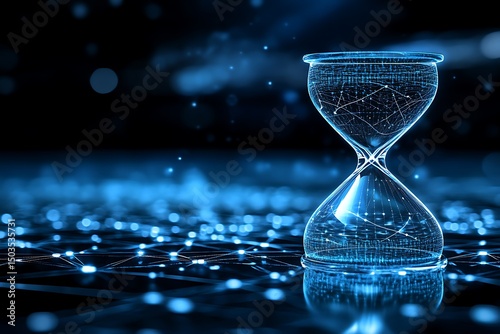 Abstract digital hourglass symbolizing the passage of time and the flow of information, conveying concepts of data and technology in a futuristic glow.