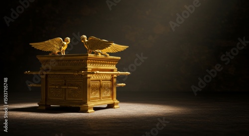 Detailed golden ark of the covenant with cherubim on dark background