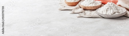 Light gray surface with bowls of flour and a linen cloth