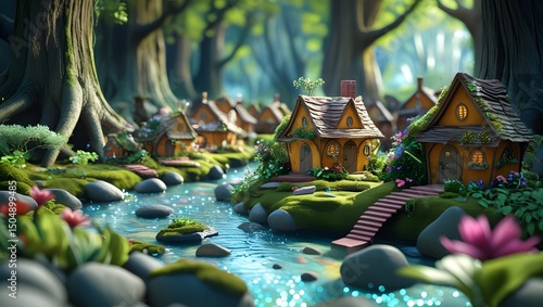 Small civilization in crystal clear water riverbank, with forest background AI Generated Image