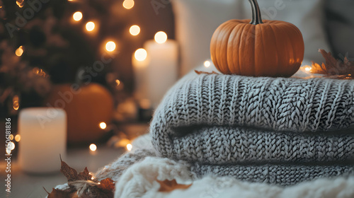 Cozy autumn scene with pumpkin, knitted sweater, and warm bokeh lights background