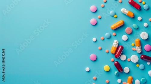 Colorful pills and capsules scattered on blue background. Medical theme. AI generative..