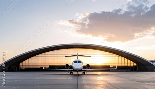 Luxury travel concept illustrated by a private jet parked in front of a futuristic hangar at sunrise symbolizing elite transportation and innovation