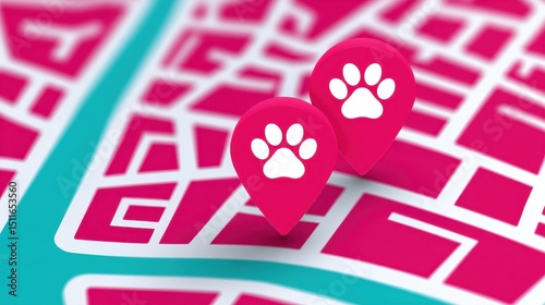 Stylized map showcasing lost and found pet locations in a city neighborhood using minimalist design and cheerful colors. National Lost Pet Prevention Month