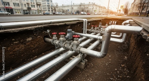 Underground pipeline of heating system with red valves and silver pipes on street, showing urban infrastructure.