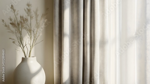Light streaming through sheer curtains, illuminating a vase of dried grasses.