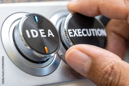Concept of idea execution depicted with dials controlled by human hand closeup