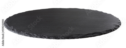 Dark gray round empty slate with selective focus isolated on white or transparent background