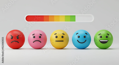 Colorful emoji faces showing a range of emotions isolated on white background, aligned under a mood rating bar