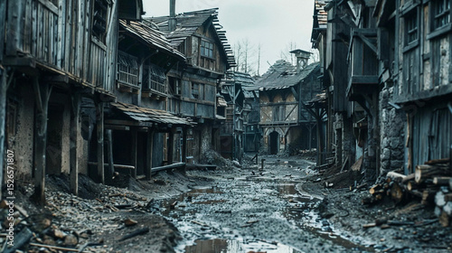 Abandoned medieval village street with crumbling stone buildings and debris scattered across cobblestone pathway showing urban decay and historical deterioration