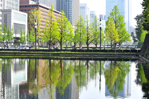 お濠に鮮やかに写り込む和田倉門近くのイチョウ並木道