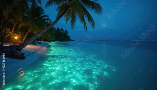 Night photo of Vaadhoo Island, Maldives. Turquoise ocean waters glowing with bioluminescent plankton, shoreline with palm trees. Mystical marine natural phenomenon, unique travel destination.