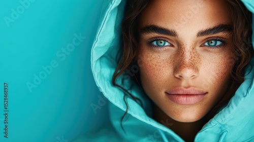 A close-up portrait of a young woman with striking blue eyes and freckles, exuding confidence and allure against a soft turquoise background.