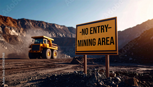 No Entry Warning Sign at Mining Site with Heavy Machinery