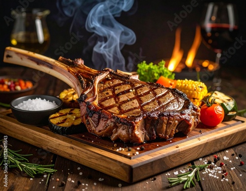 Tomahawk steak z kością na desce, grillowane warzywa, sól morsk