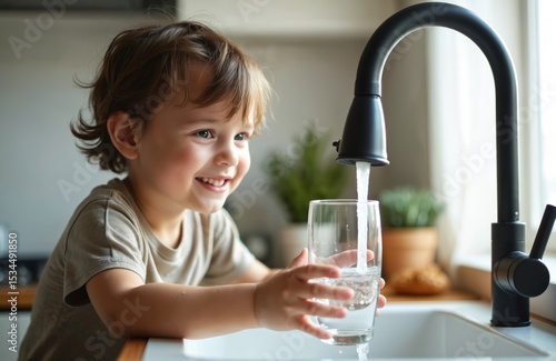 Smiling child draws water from kitchen faucet into glass. Kid enjoys clean water in home. Concept availability, safety of clean water, childhood hydration.