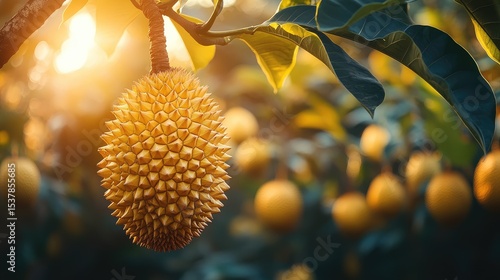 Golden Durian Fruit Hanging in Orchard at Sunrise