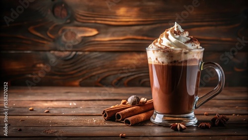 A steaming glass mug filled with rich hot chocolate topped with creamy whipped cream and sprinkled with cocoa powder details on a warm wooden table background