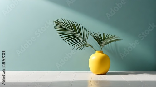 Yellow Vase with Palm Fronds Against Teal Wall and White Tiled Floor