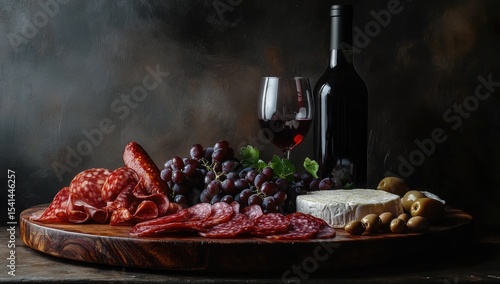 #1051714725A table with a variety of meats and cheeses, a bottle of wine