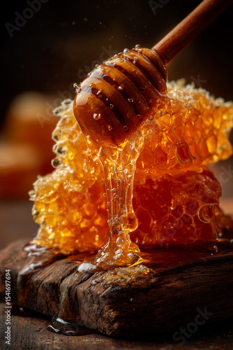 Pionowe ujęcie miarki do miodu zanurzonej w plastrze miodu, z którego spływa gęsty, złocisty miód. Naturalny i słodki widok.