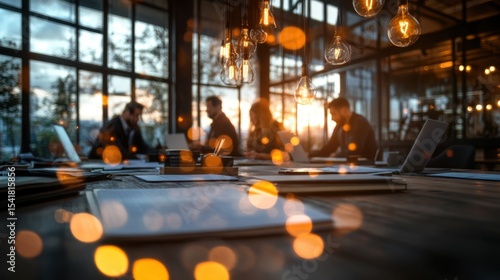 Business leaders collaborating in a modern office, achieving financial growth and equity, warm lighting, and optimistic tone