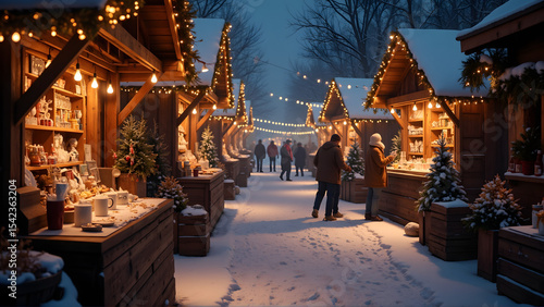 holiday market with twinkling string lights, intricate wooden stalls with crafts, steaming mugs of cocoa, cozy wintery and cozy, wintery