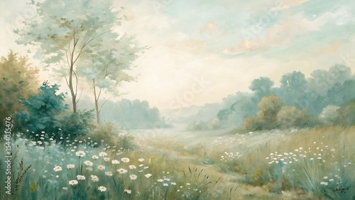 Serene watercolor painting of a peaceful meadow scene with daisies and trees