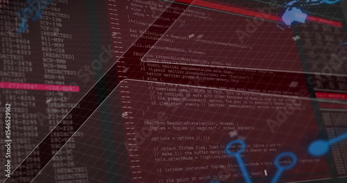 Translucent red code panel executing JavaScript on dashboard, with 3D grid logs and world map nodes