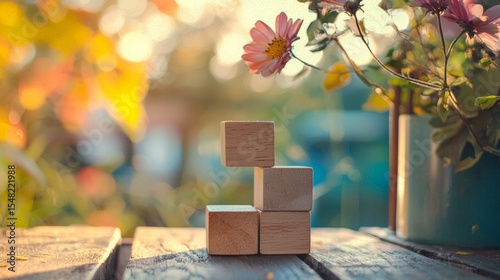 Wooden cubes and vase with blossoms on rustic table in warm sunlight for natural aesthetic composition stilllife